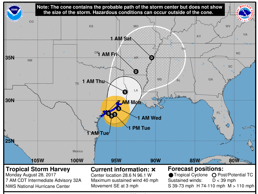 Over the past few days, Hurricane Harvey has devastated thousands of people in southeastern Texas and the surrounding area. The category 4 hurricane has topped 130 miles per hour and dumped 50 inches of rain around Houston. In addition to this unprecedented devastation, the hurricane has also wreaked havoc on the region’s refining industry. According to Goldman Sachs, the hurricane has shut down 3 million barrels of oil refining capacity per day. Such drastic shutdowns will likely result in a spike in crude-oil inventories over the next few months. Oil demand has taken months to recover after past hurricanes, and may do the same with Harvey. Though time will tell to what extent Harvey affects oil demand, gasoline futures already reached two-year highs on Monday in the wake of the hurricane. After closing a week ago at $1.5841 per barrel, the 2017 September gasoline RBOB futures contract reached $1.7799 on Monday before closing at $1.7123. Customers will feel the effects of this increase at the pump. But the storm is not done. Harvey is expected to cause even more short-term and long-term damage due to its slow-moving nature. Below is the National Weather Service’s projection for Harvey’s path: